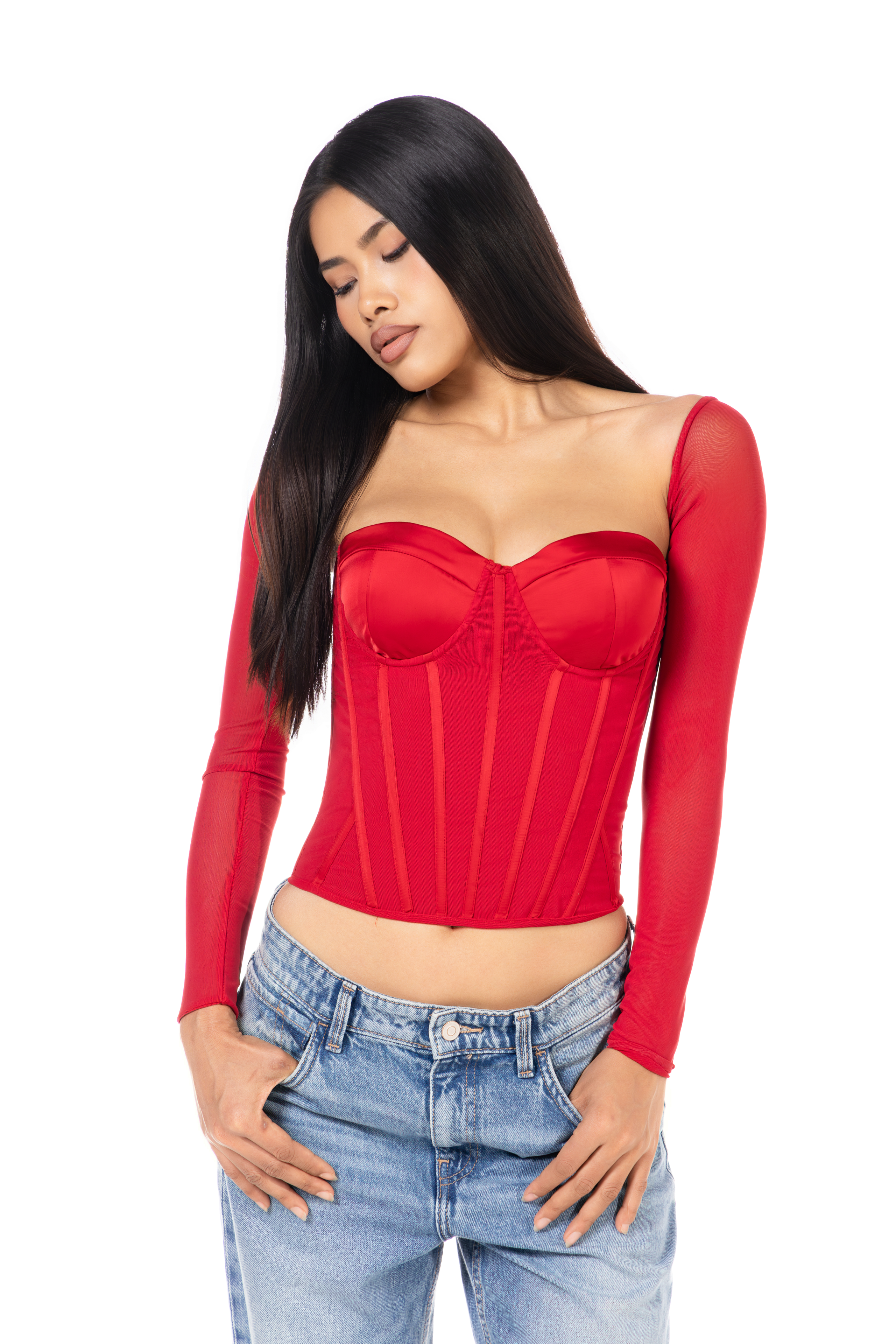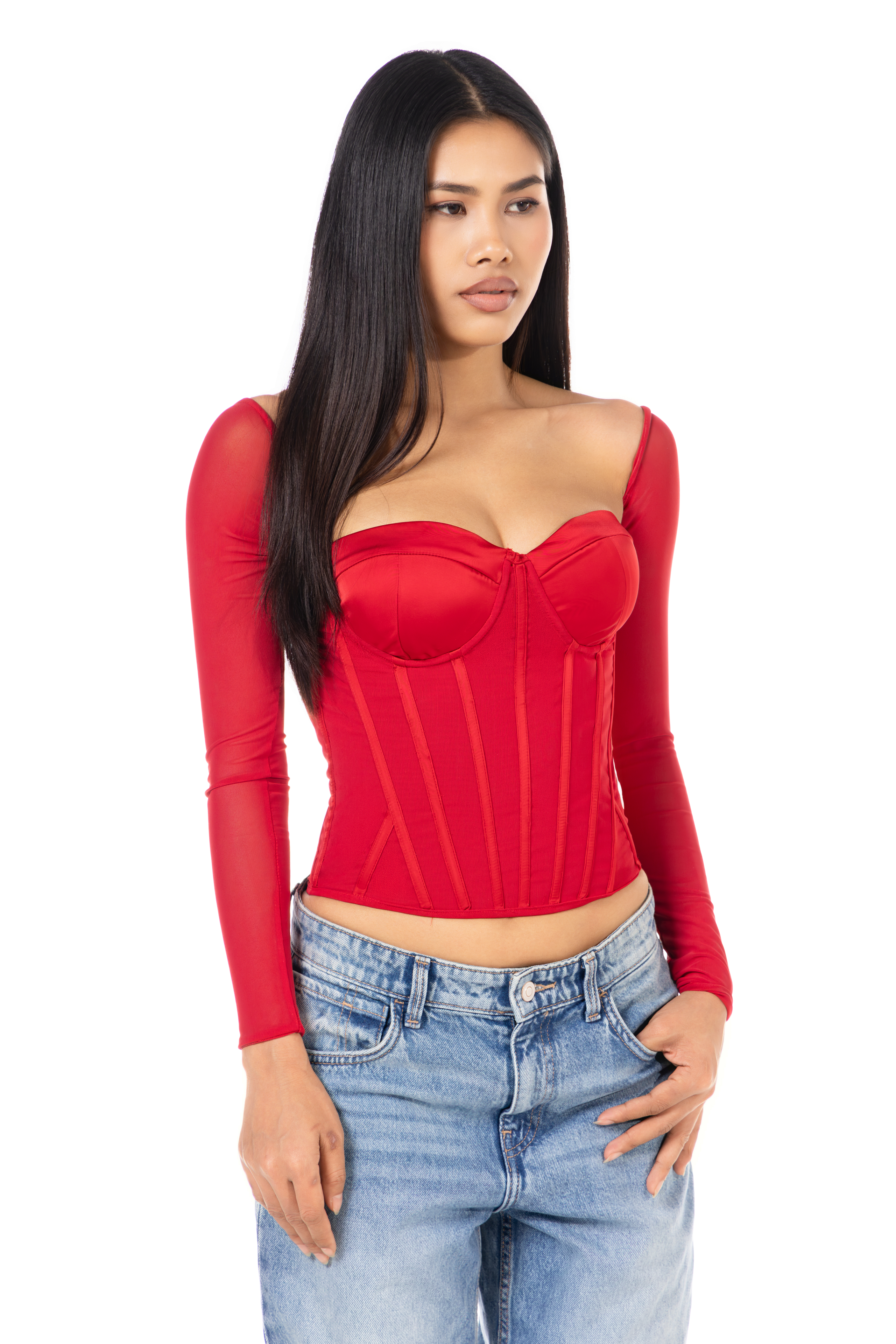 Key features: Underwired foam cups, sheer mesh long sleeves, corset bodice, straight back concealed back zip